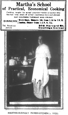 Even before being replaced, some of these and other houses on Harvard Street were put to new uses. The house at 302 Harvard, for example, became a boarding house, lunchroom, and cooking school run by a German immigrant named Martha Albinsky. Her daughter, Gertrude (Albinsky) Millett, wrote about it in the Brookline Chronicle half a century later and included a photo of her mother in her kitchen. (1976 article, at bottom of linked page.)